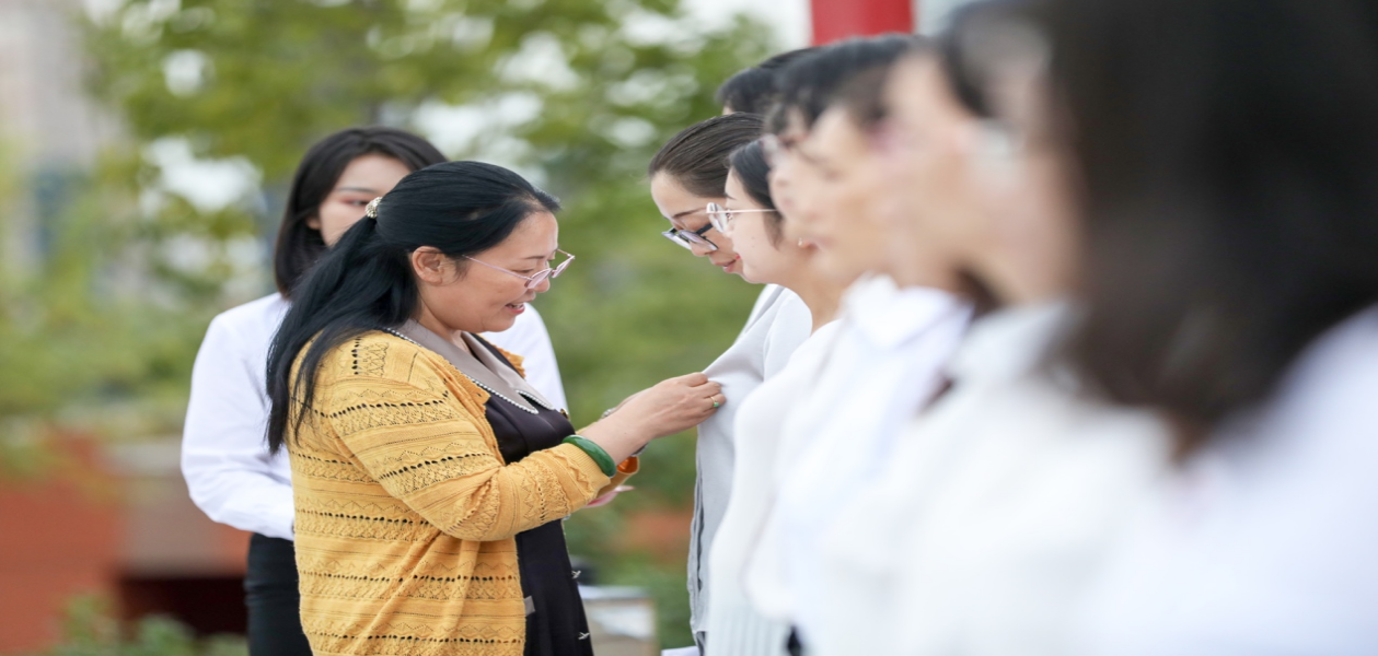 随后,校党委副书记、执行校长徐爱民,组织部部长黄岩及青岛第五届高校教学名师获得者庄新颖、单菁华为新进教师佩戴校徽。