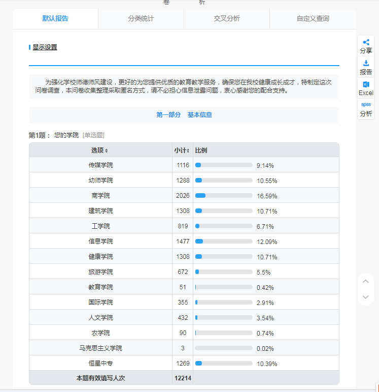 组织师德师风问卷调查活动。围绕师德、师表、师风等行为规范,以师德素养、爱岗敬业、教书育人、关爱学生等为核心内容,对我校教师的思想政治素质、教育理念、从教行为、工作态度、学术理想、学术奉献及心理健康水平等方面的师德师风现状展开调查,全校共有12214名学生、510名教职工参与问卷,积极为学校的教育事业建言献策。